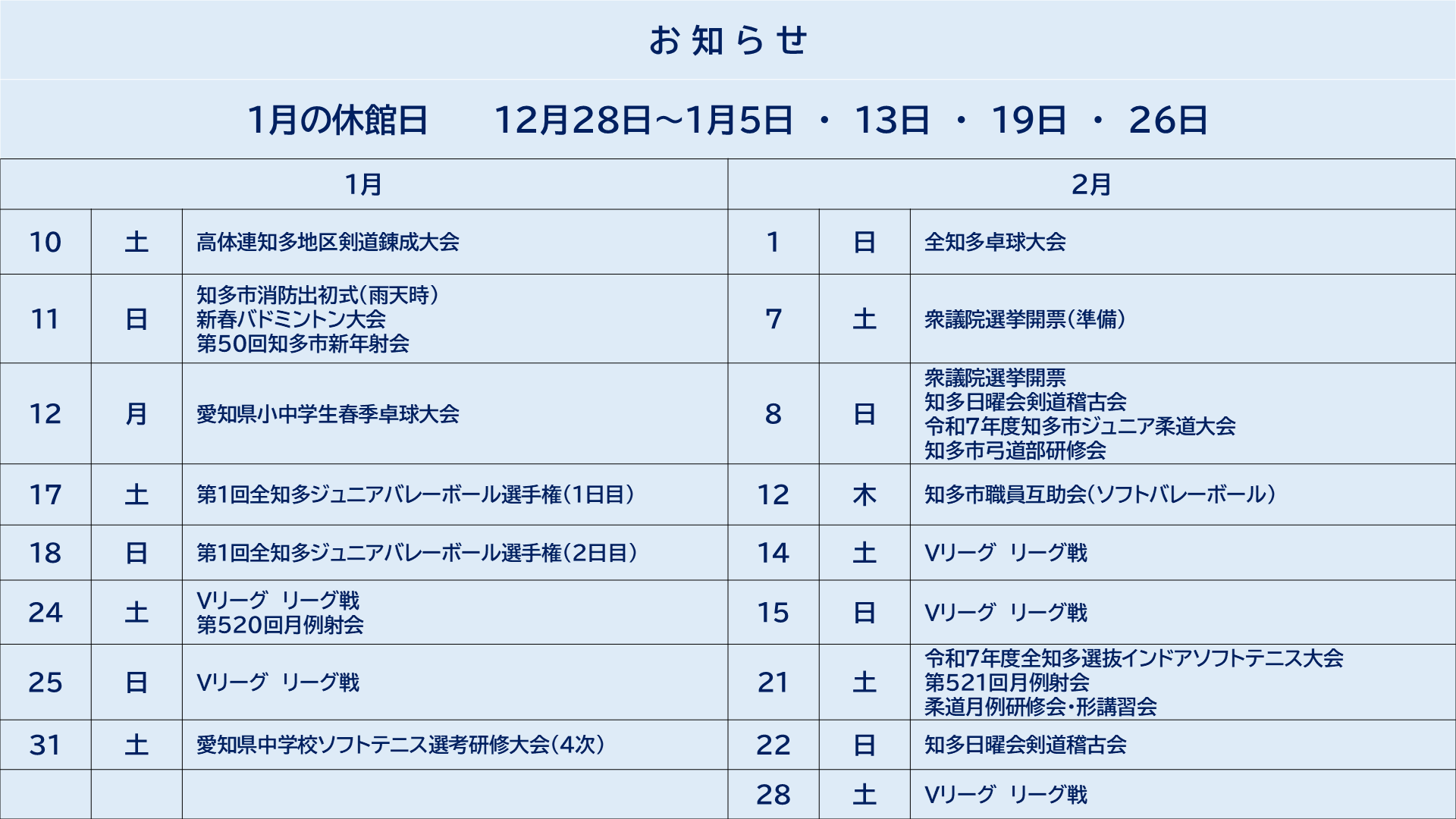 体育館 1月・2月の催し物
